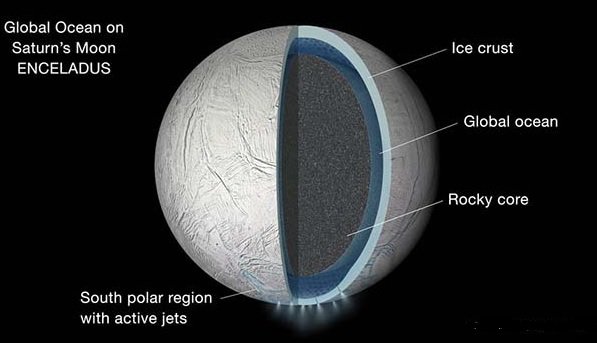 عکسهای جدید فضاپیمای کاسینی از قمر زحل وضعیت خاصی از فوران محتوای این قمر از قسمت جنوبی آن را نشان میدهد که احتمال وجود حیات در آن را افزایش میدهد.
