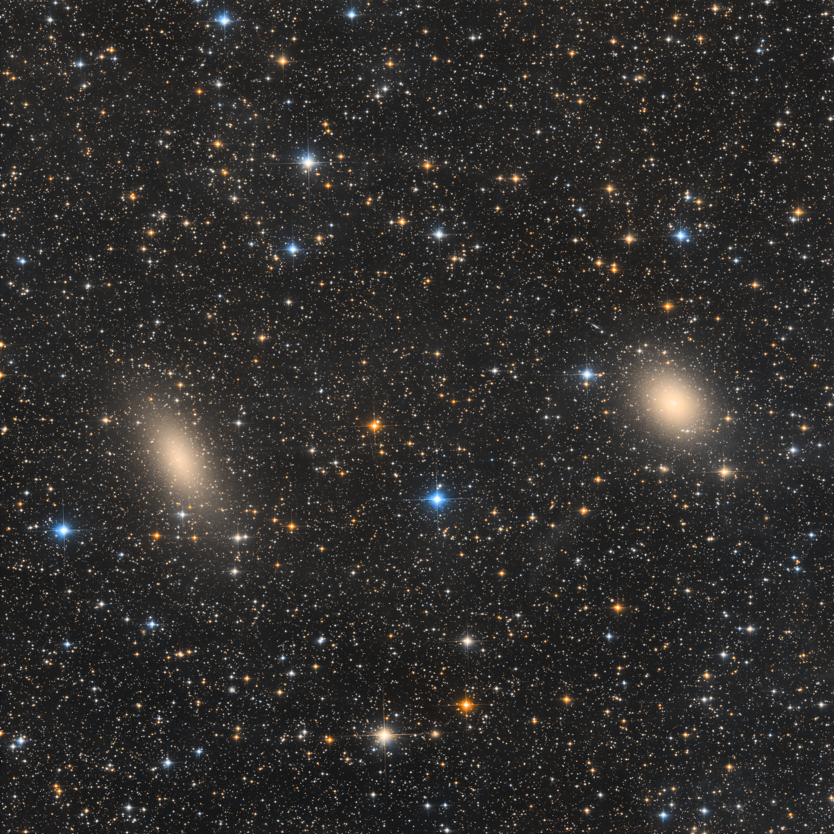 Dwarf galaxies NGC 147 (left) and NGC 185 stand side by side in this deep telescopic portrait. The two are not-often-imaged satellite galaxies of M31, the great spiral Andromeda Galaxy, some 2.5 million light-years away. Their separation on the sky, less than one degree across a pretty field of view toward the constellation Cassiopeia, translates to only about 35 thousand light-years at Andromeda's distance, but Andromeda itself is found well outside this frame. Brighter and more famous satellite galaxies of Andromeda, M32 and M110, are seen much closer to the great spiral. NGC 147 and NGC 185 have been identified as binary galaxies, forming a gravitationally stable binary system. But recently discovered faint dwarf galaxy Cassiopeia II also seems to be part of their system, forming a gravitationally bound group within Andromeda's intriguing population of small satellite galaxies.